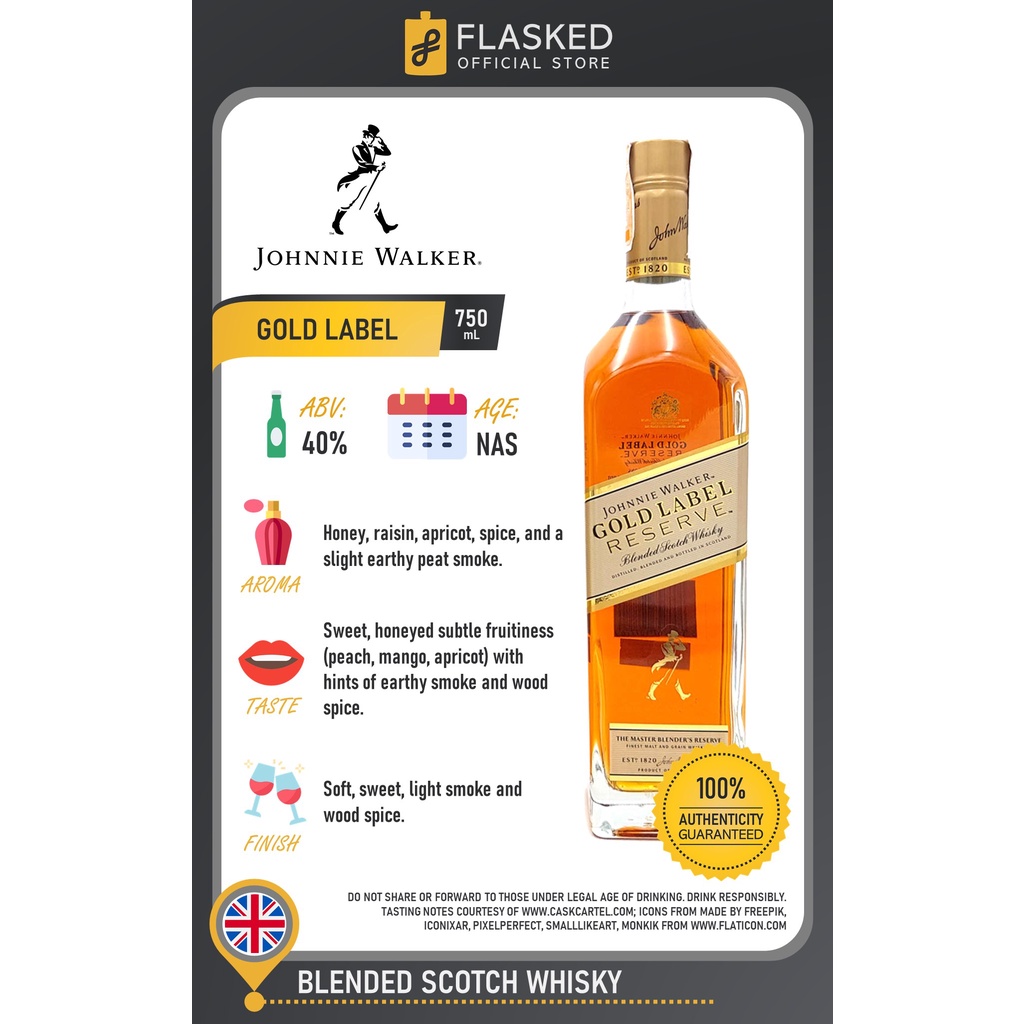 Johnnie Walker Gold Label Reserve Blended Scotch Whisky | prices ... Packaged in a limited-edition bottle, Johnnie Walker Gold Label Reserve delivers a combination of orange, cloves and melon surrounded by smoke. Juicy and spicy on the palate with a firm body and fine roasted aromas on the finish. The good structure is crowned by a complex finish. Bottled at 40% ABV.