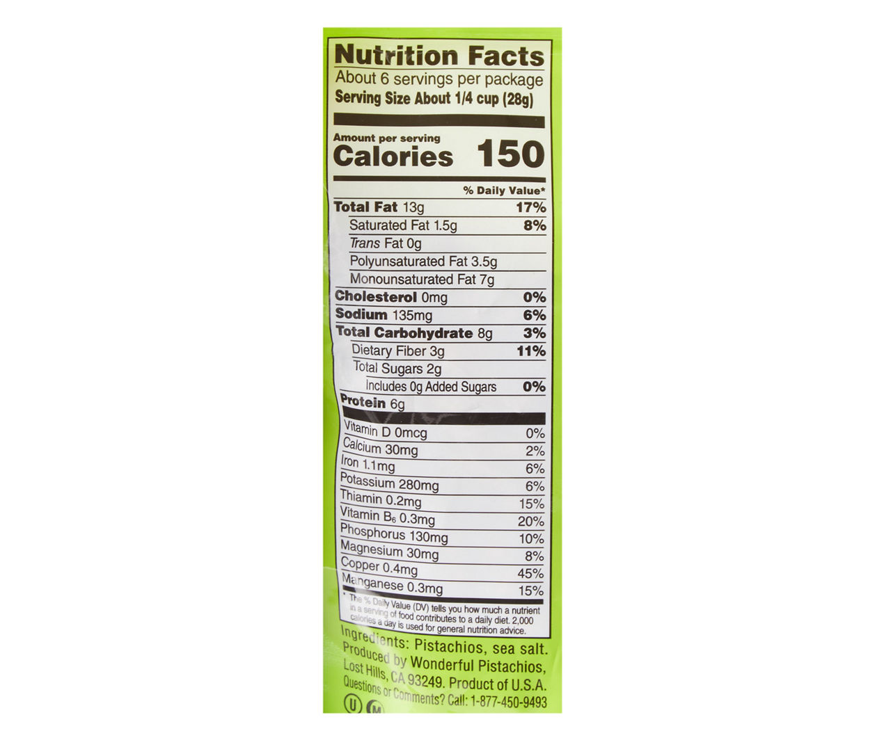 Wonderful Pistachios, No Shells, Roasted and Lightly Salted Pistachios, No Shells, Roasted and Lightly Salted About 6 Serving Per Container Amount Per Serving % Daily Value* *Percentage Daily values are based on a 2,000 calorie diet.Your Daily values may be higher or lower depending on your calorie needs we recommend Wonderful No Shells Roasted and Salted Pistachios, 6 oz $7.19 each ($1.20/oz)