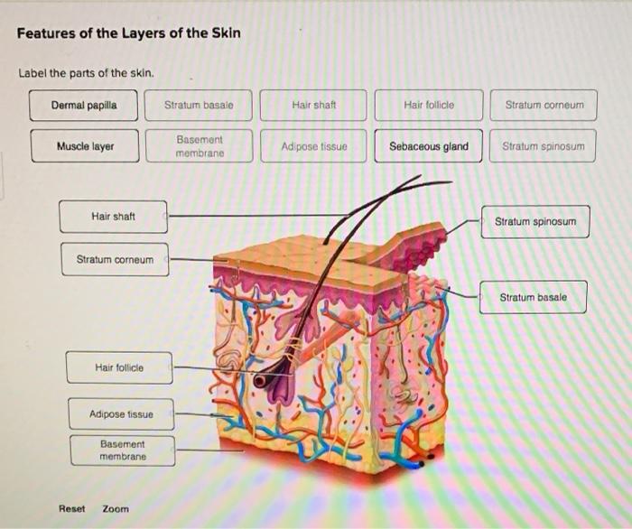Labeling 1 - McGraw Hill Education Then select the correct answer and release. then hit the "Score Test" button at the bottom. 1. Epidermis , Basement membrane , Dermis , Hair shaft , Capillary , Dermal papilla , Subcutaneous layer , Sweat gland pore , Stratum basale ,
