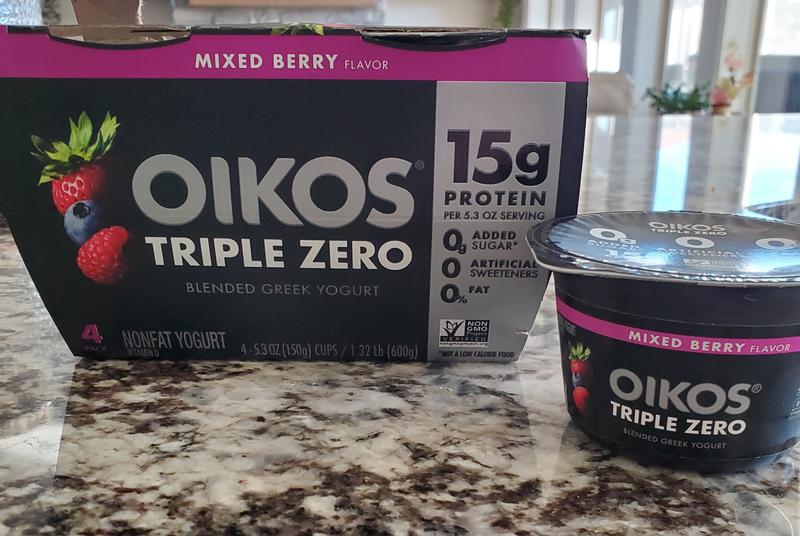Oikos Triple Zero Variety Pack Greek Yogurt, 5.3 Oz. Cups, 6 Count Oikos Triple Zero Greek Nonfat Yogurt gives you all the flavor you seek in a Greek yogurt--but with 0 added sugar*, 0 artificial sweeteners, and 0 fat, with 15 grams of protein per 5.3 oz cup. Full of delicious strawberry (or mixed berry) flavor, this Greek nonfat yogurt makes a delicious snack any time of day.