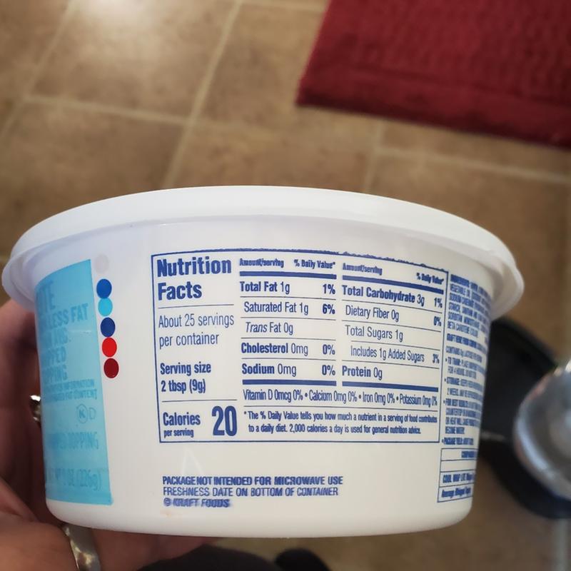 Calories in Kraft Cool Whip Lite and Nutrition Facts - FatSecret Cool Whip Lite Nutrition Facts Serving Size 2 tbsp (9 g) Amount Per Serving Calories 20 % Daily Values* Total Fat 1.00g 1% Saturated Fat 1.000g 5% Trans Fat 0.000g Cholesterol 0mg 0% Sodium 0mg 0% Total Carbohydrate 3.00g 1% Dietary Fiber 0.0g 0% Sugars 1.00g Includes 1.00g Added Sugars 2% Protein 0.00g Vitamin D - Calcium - Iron - Potassium -