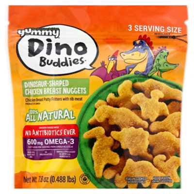 Yummy Dino Buddies Dinosaur-Shaped Chicken Breast, Nuggets Yummy Dino Buddies Dinosaur-Shaped Chicken Breast Nuggets, 21 oz Chicken Breast Patty Fritters with Rib Meat 100% all natural* *Minimally processed no artificial ingredients Chicken used raised without hormones. Federal regulations prohibit the use of hormones in poultry. 2 New.