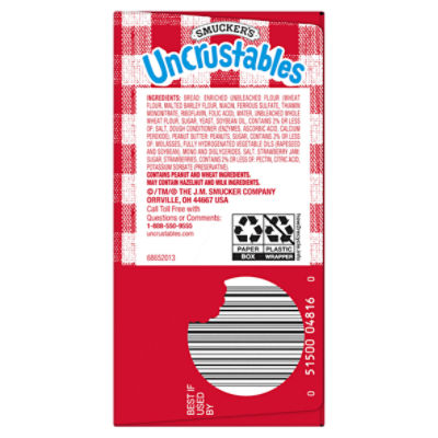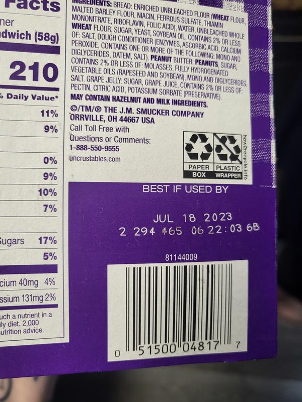 Smucker's Uncrustables Peanut Butter and Grape Jelly Sandwiches Per Sandwich: 210 calories; 1.5 sat fat (8% DV); 220 mg sodium (9% DV); 9 g total sugars. 6 g protein. No high fructose corn syrup. Non GMO/GE: Certified by NSF. Certified NSF Non-GMO True North by NSF International. Call toll free with questions or comments: 1-888-550-9555. uncrustables.com. Please recycle.