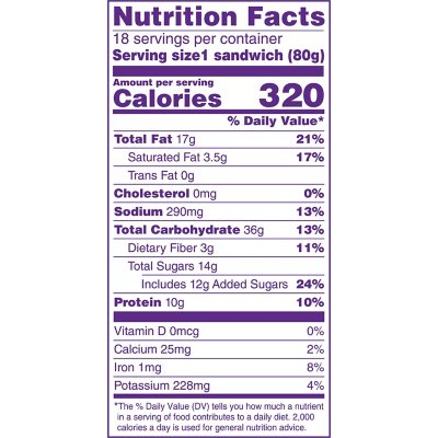 Peanut Butter and Grape Jelly Sandwich | Uncrustables® Total Sugars 10g Incl 8g of Added Sugars 17 % Protein 6g 5 % Vitamin D 0mcg 0% Calcium 40mg 4% Iron 1mg 6% Potassium 131mg 2% *The % Daily Value tells you how much a nutrient in a serving of food contributes to a daily diet. 2000 calories a day is used for general nutrition advice. Ingredients